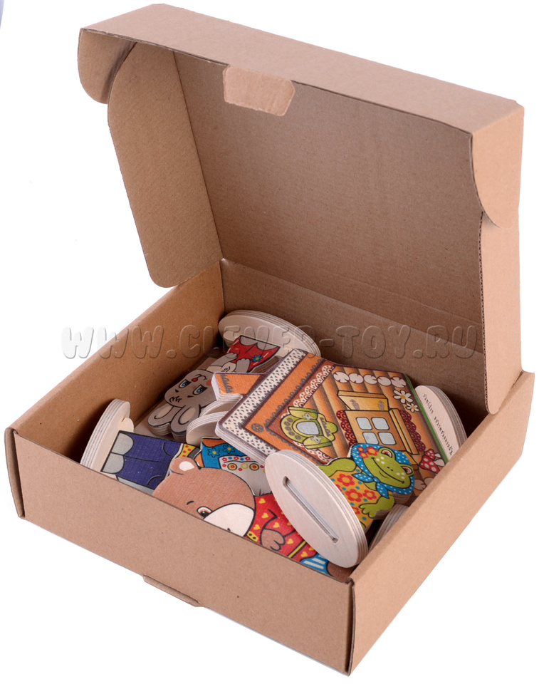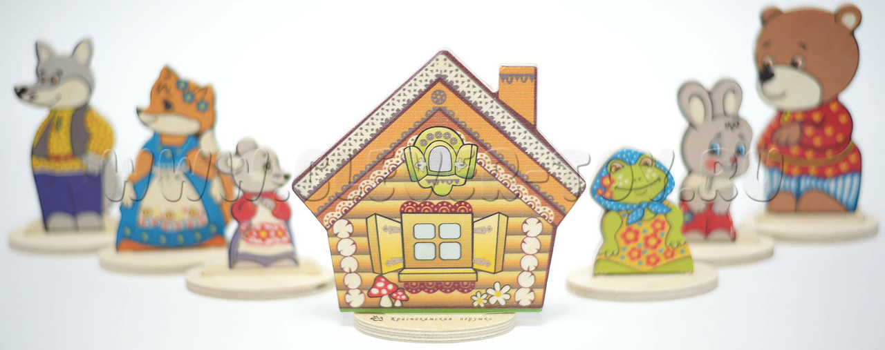 - 7 сказочных персонажей на подставках(заяц, мышка,лягушка, медведь, волк, лиса, теремок) от 6,5 до 12 см.;