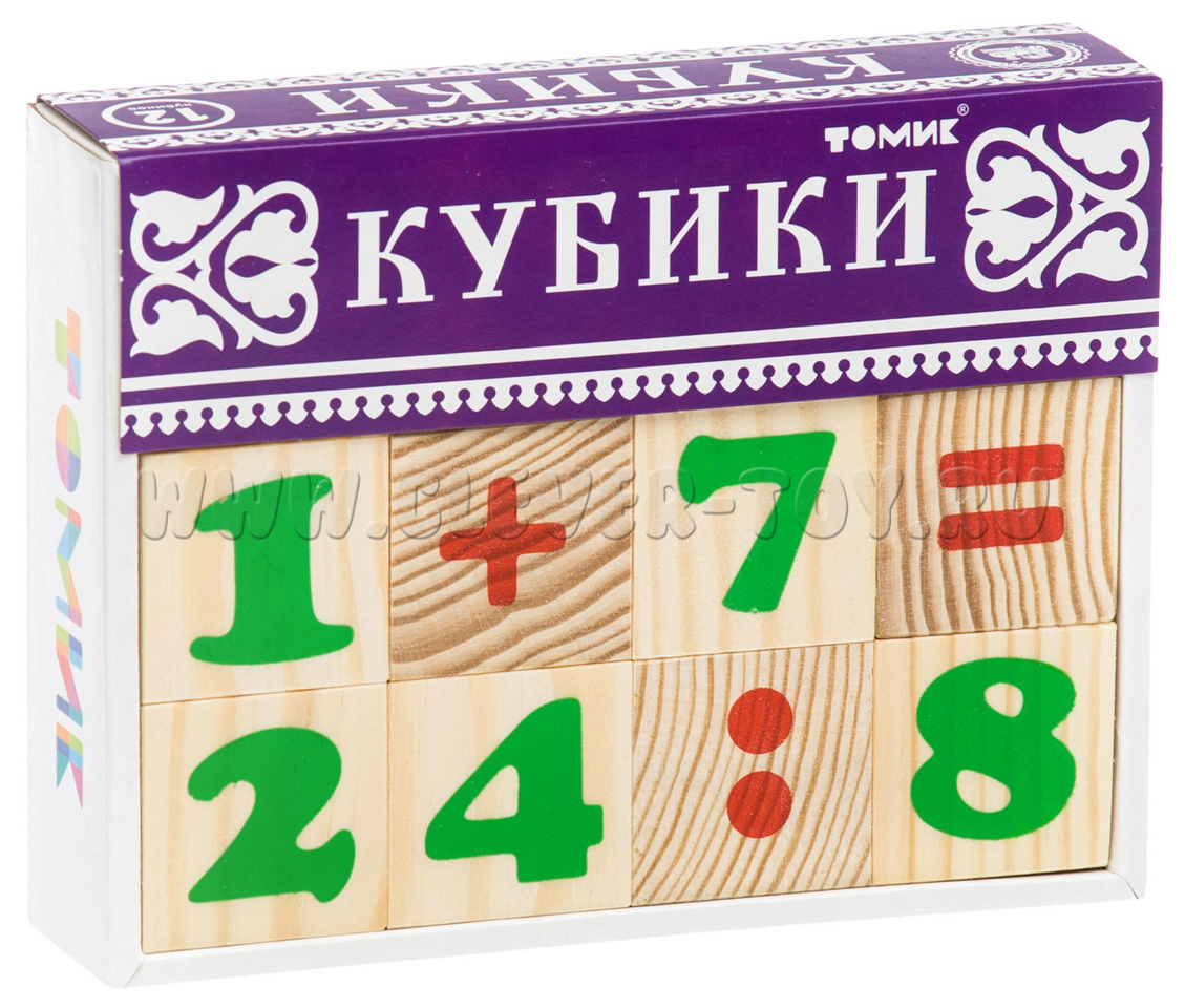 В состав входит девять кубиков с цифрами и простейшими математическими операциями.