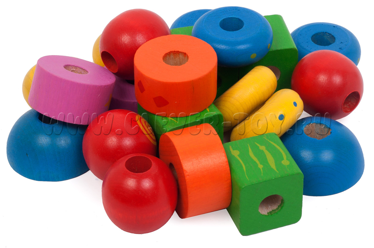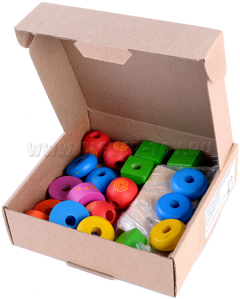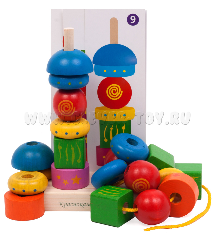 Игра предназначена для детей с 1 года. Пирамидку можно использовать для изучения цвета, счета, геометрических фигур и как шнуровку, делая из деталей бусики.