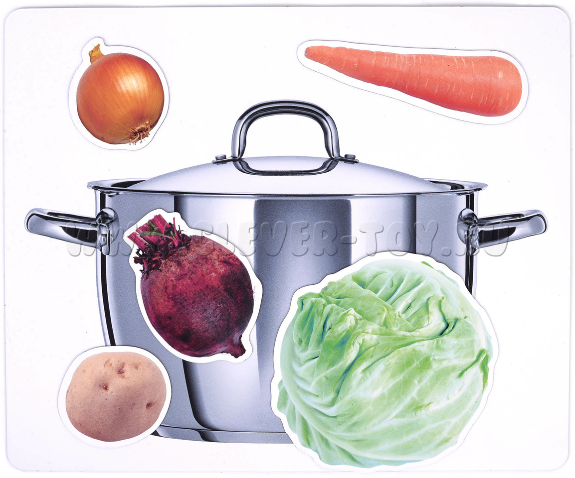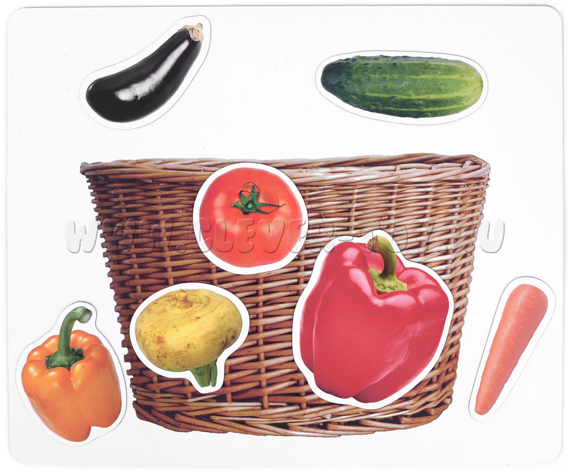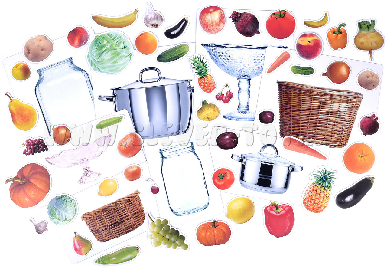 В комплект входят 8 магнитных полей двух размеров - 29 см х 24 см и 29 см х 15,5 см, - на каждом из которых изображён один из предметов: корзинка, кастрюля, банка или ваза. Дополняют набор 48 карточек разного размера с изображениями фруктов и овощей.