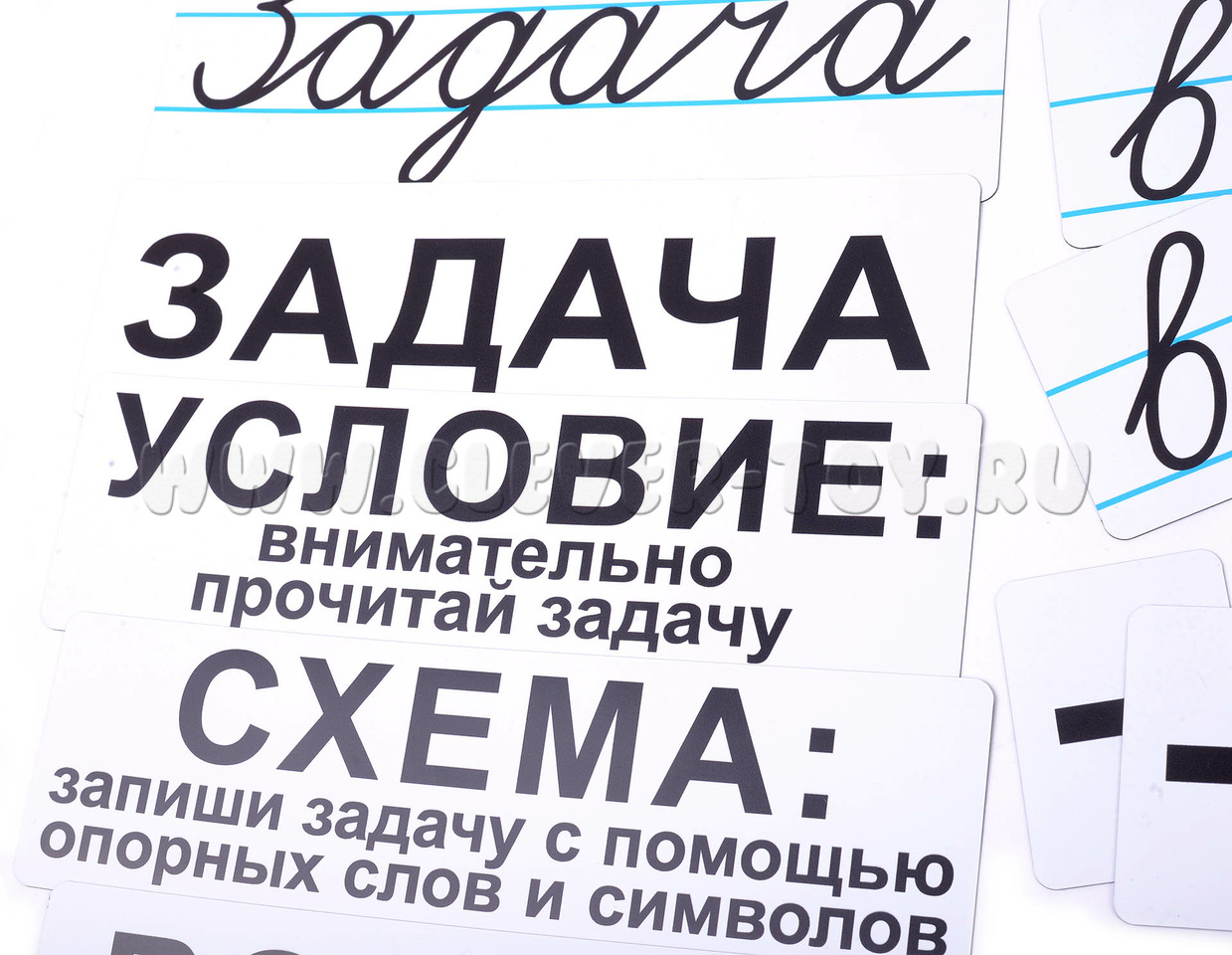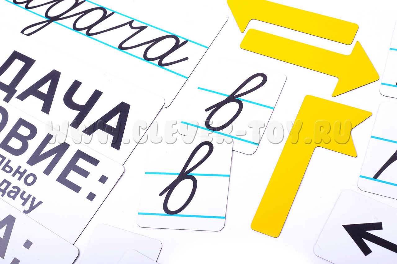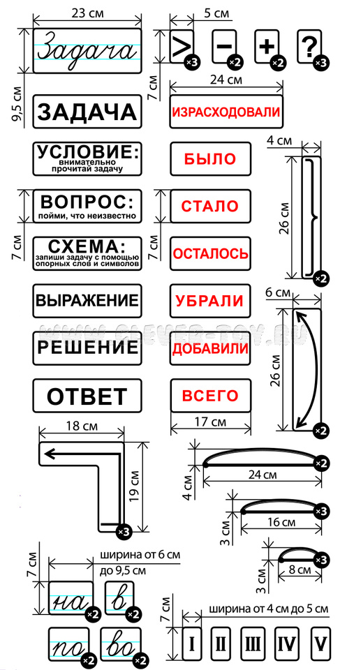 Карточка со словом «Задача», написанная в строчку. Четыре карточки с разными предлогами, по две штуки каждой, также написанные в строчку прописными буквами. Семь магнитных карточек со словами, которые помогут ребёнку понять суть задачи. Семь карточек с красными словами — это вспомогательные карточки, с помощью которых ребёнок быстрее научится находить правильный ответ. Четыре карточки со знаками, по несколько штук каждой. Пятнадцать карточек-схем. Римские цифры до пяти. Размер карточек позволяет видеть их даже с дальних парт.