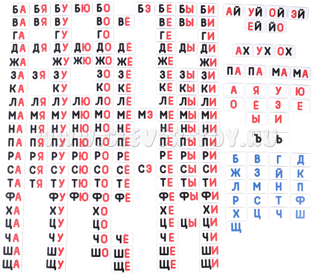 200 магнитных карточек со слогами и буквами.
