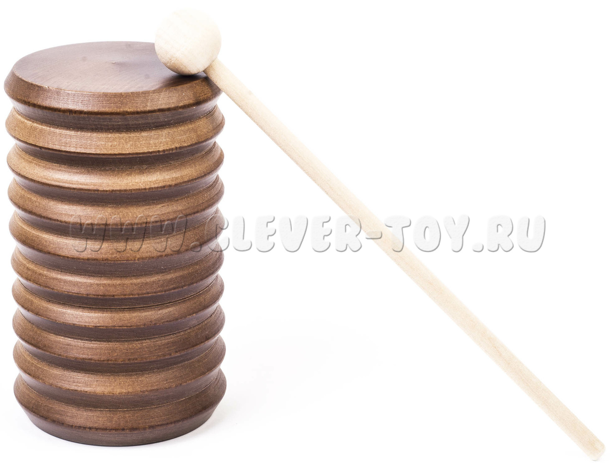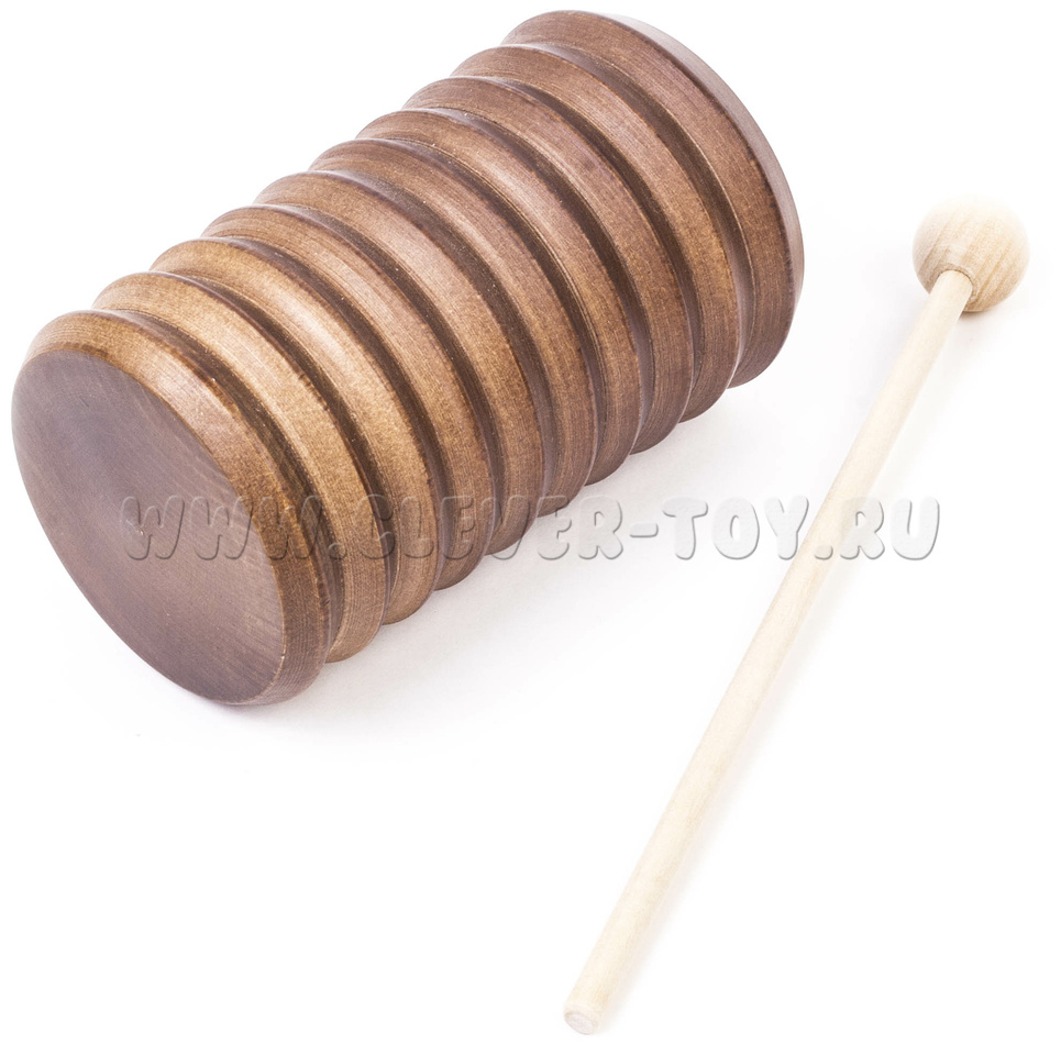 Погремушка представляет собой полый деревянный цилиндр диаметром 65 мм и высотой 120 мм. Внутрь стакана засыпана охотничья дробь. Сверху стакан наглухо закрыт деревянной крышкой. С наружной стороны ребристый. Канавки под углом 90 градусов выполнены токарным способом. Музыкальный инструмент комплектуется ударной палочкой с шариком на конце. Материал: липа.