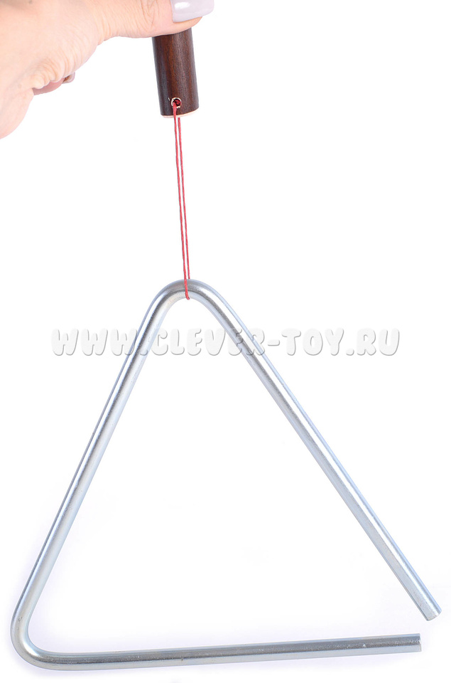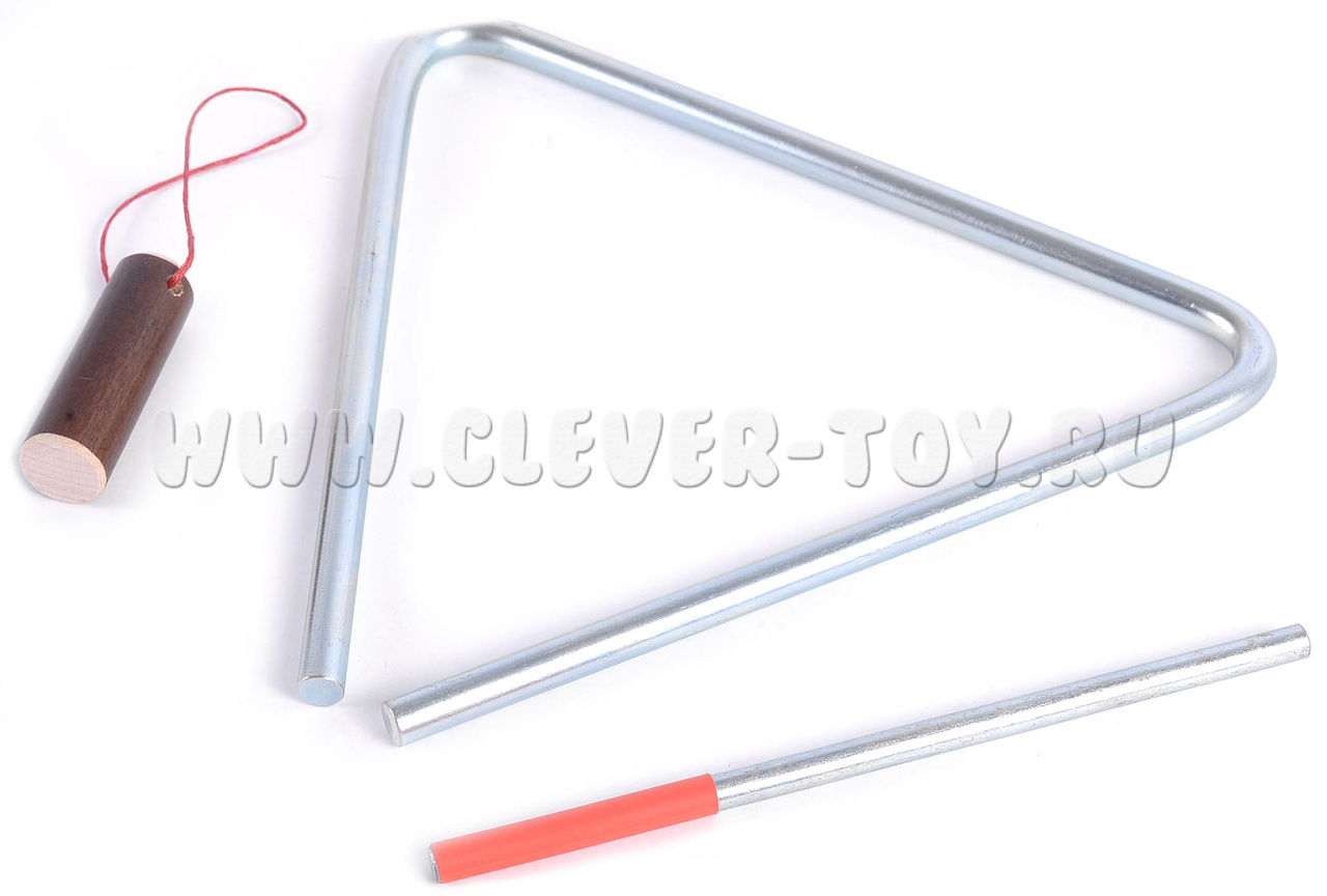 Треугольник выполнен из стали диаметром 8мм, длина стороны - 18см. Гальваническое покрытие не ухудшает качество звука и не разрушается при механическом воздействии. Ударная палочка из нержавеющей стали.