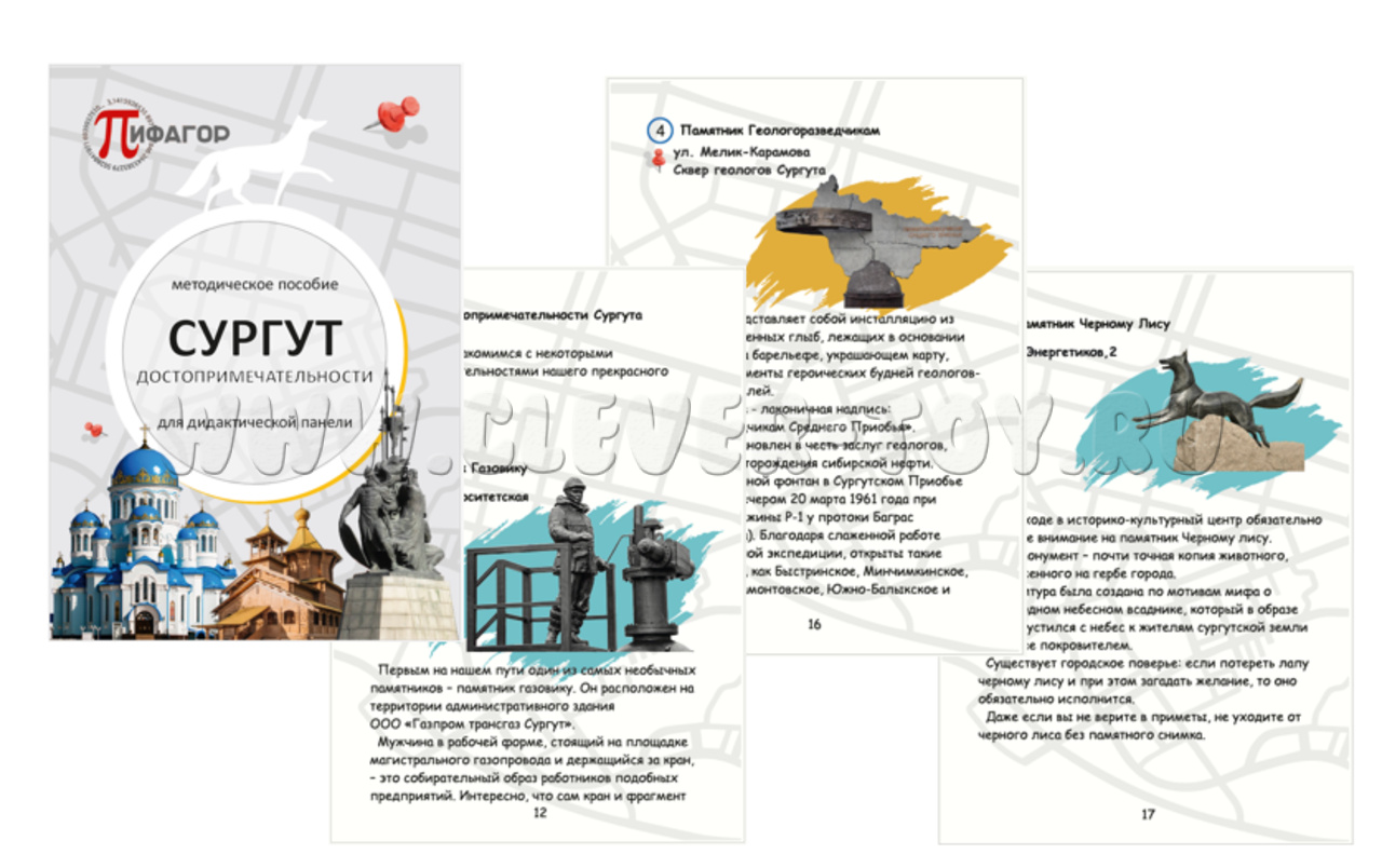 - Методическое пособие формата А5 - рекомендации для педагога по проведению занятий, посвящённых истории и достопримечательностям Сургута.