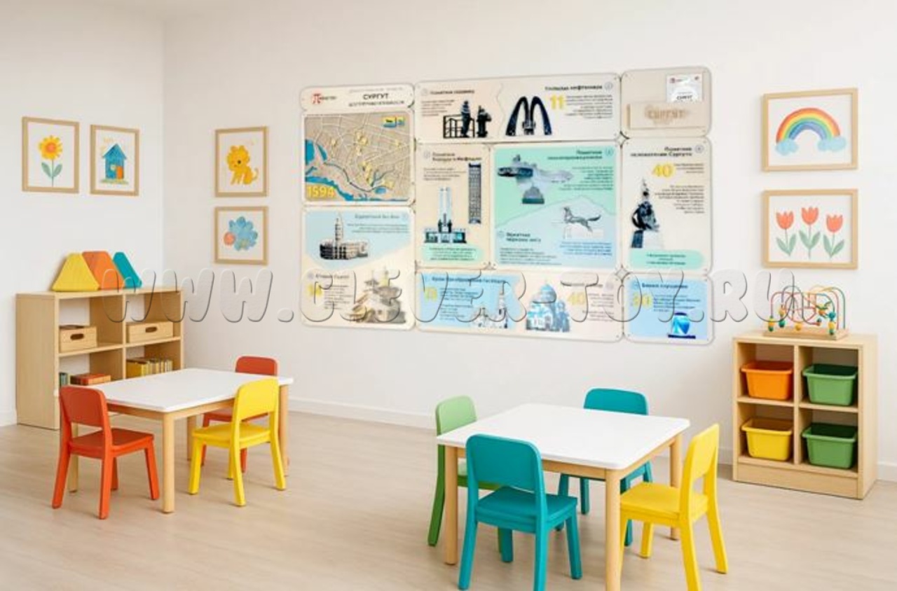 Дидактическая панель "Сургут: достопримечательности" знакомит детей дошкольного возраста с историей и культурным наследием города Сургут.