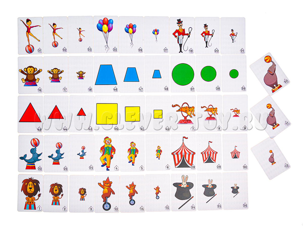2. Игра «Цирковой бой». Все карточки делятся между игроками. Каждый игрок складывает свои карты стопкой лицевой стороной вверх. Игроки одновременно выкладывают верхнюю карту своей стопки. Игрок, выложивший карточку с самым большим изображением, забирает себе все карты…