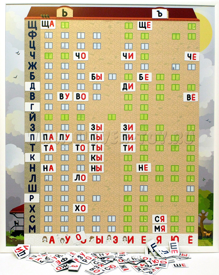 Некоторых карточек-слогов нет. Это значит, слова с их использованием либо очень редкие, либо вовсе отсутствуют. В этом случае на нашем "Слоговом домике" нет даже окошек для этих карточек.
