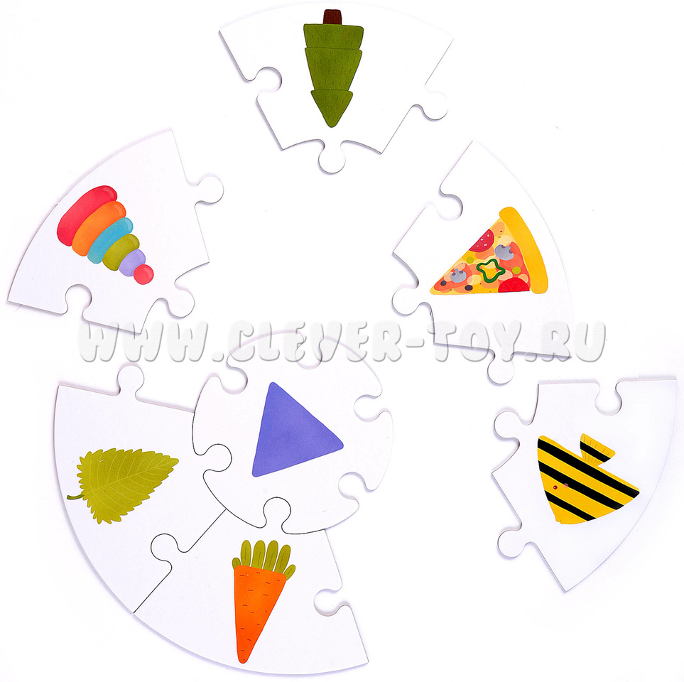 3. Игра на стороне с белым фоном в команде от 2 до 6 человек. Раздайте игрокам центральные части пазлов, перевернутые белой стороной вверх. Перемешайте остальные элементы и случайным образом выберите один из них, покажите играющим. Тот, у кого такая же фигура изображена на серединке, забирает элемент себе. Побеждает игрок, быстрее всех собравший полный круг.