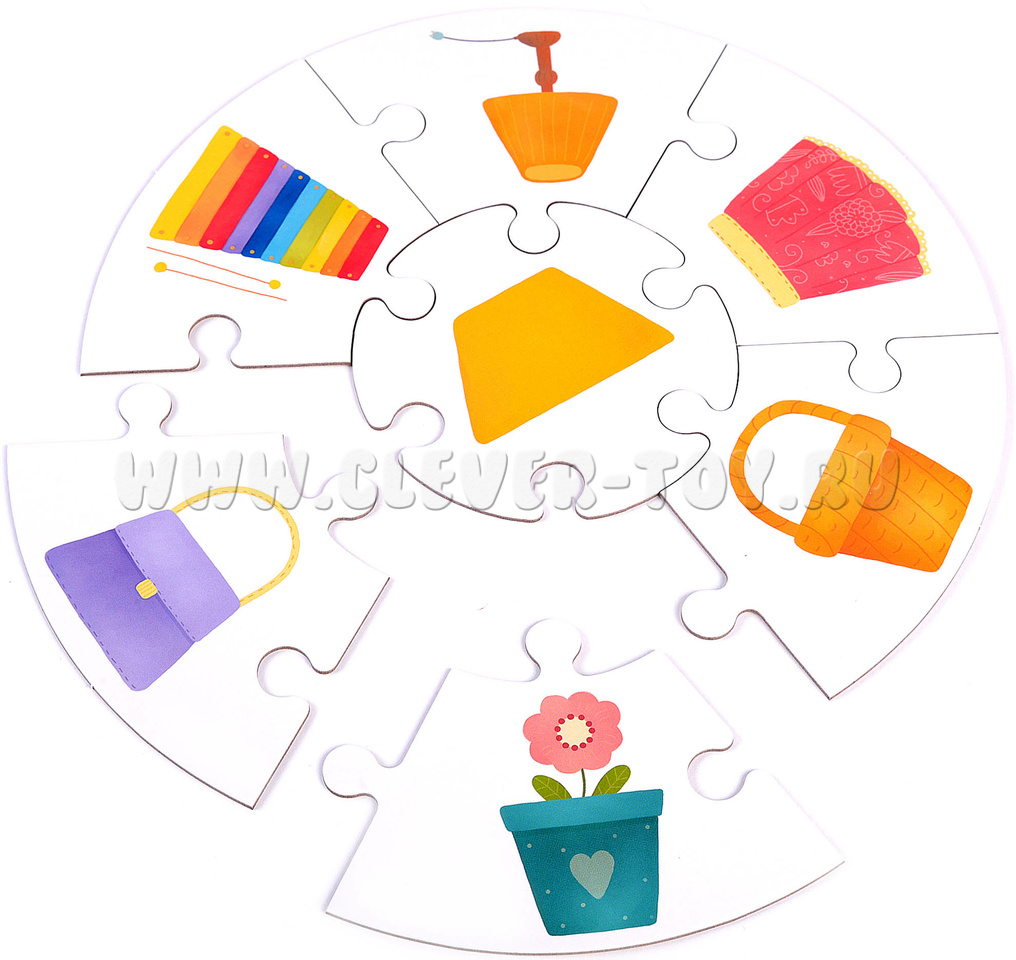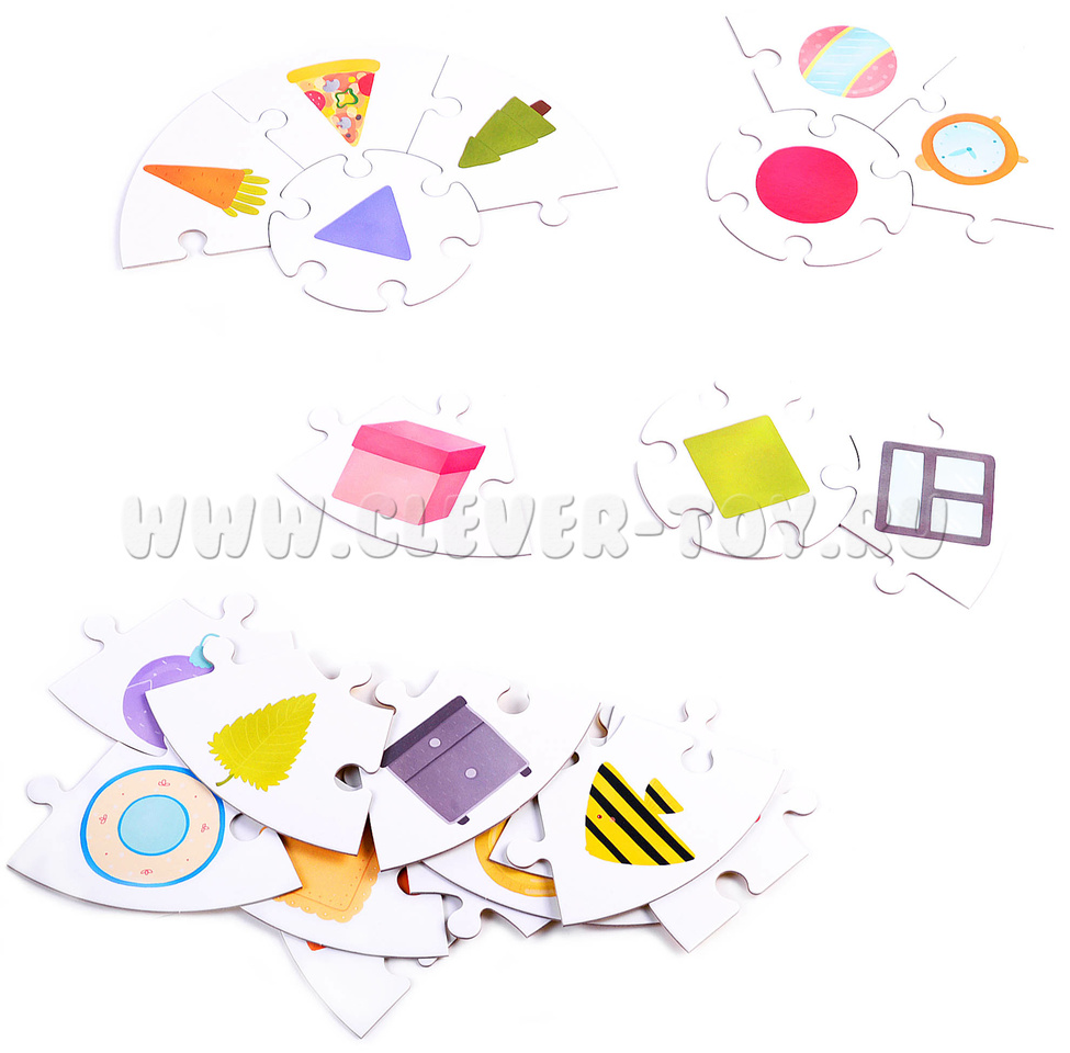 1. Игра на стороне с белым фоном. Разложите на столе круглые центральные части головоломок, остальные элементы перемешайте. Предложите малышу подобрать к каждой серединке 6 подходящих элементов и сложить пазл. Для проверки можно использовать обратную сторону пазла - если все кусочки собраны верно, на оборотной стороне будут нарисованы одинаковые предметы;