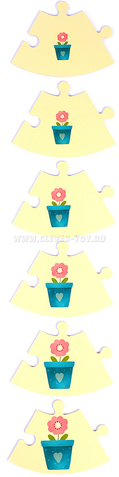 В набор входит 6 двухсторонних пазлов по 7 элементов в каждом.