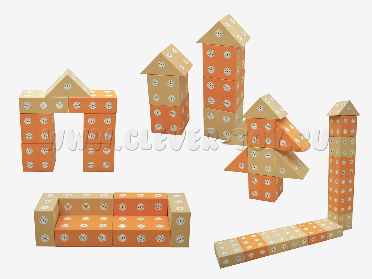 Напольный конструктор выполнен в двух цветах.Крупные детали в виде геометрических фигур выполнены из мягкого гипоаллергенного материала. Крепления имеет магнитную систему для быстрой и простой стыковки-расстыковки деталей. У каждой детали есть от 14 до 24 вариантов магнитной стыковки, что дает полную свободу для творчества.