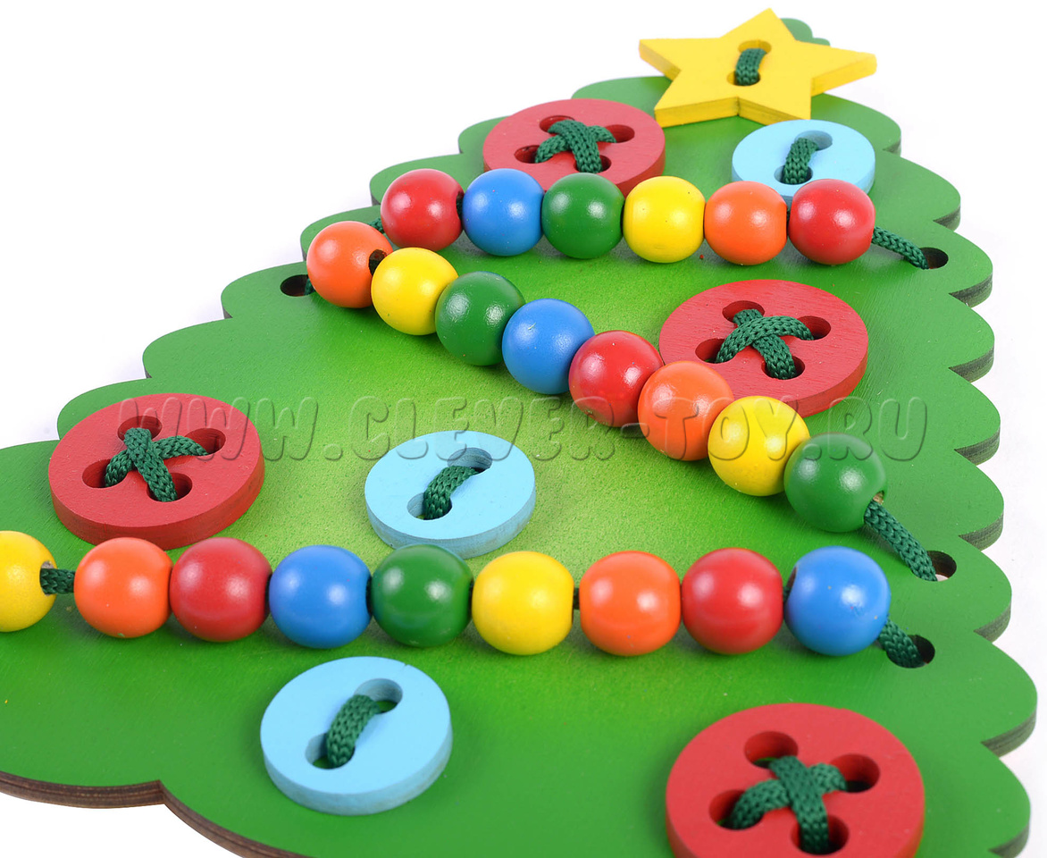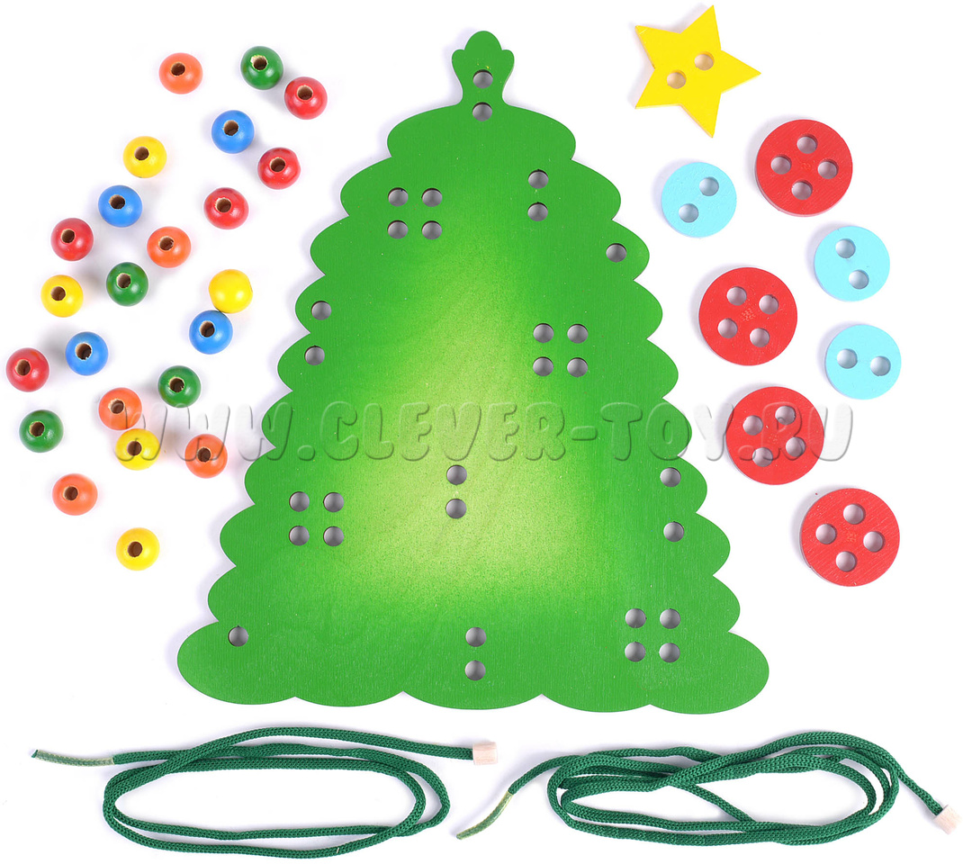 Шнуровка "Новогодняя Елочка" предназначена для развития мелкой моторики и координации движений в игровой форме. Ребенок узнает, как пришиваются пуговицы и научится делать стежки.