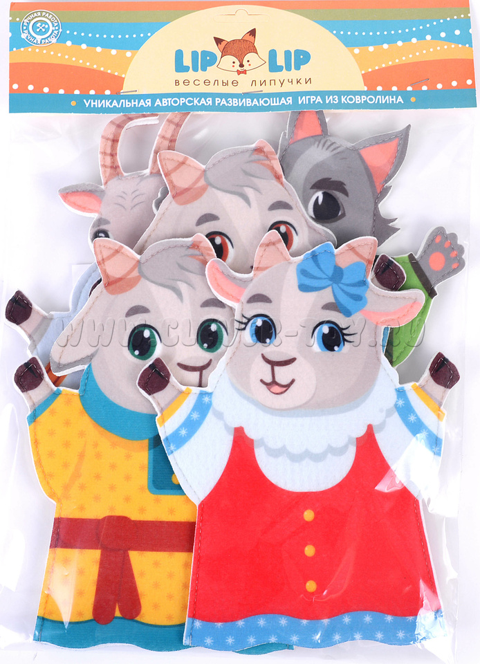 В наборе 5 фигурок: коза, козленок (2 шт.), козочка, волк. Средний размер фигурки 195*240 мм.