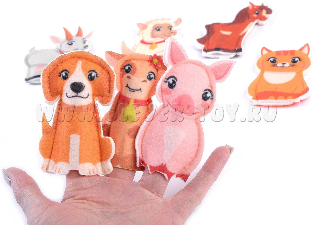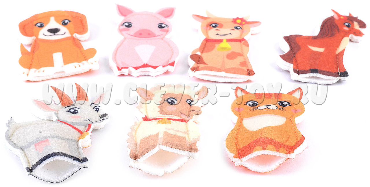 Набор пальчикового театра состоит из: 7 фигурок (размер: 9 см) с изображением домашних животных (собака, лошадь, кот, свинья, коза, овца, корова) и инструкции с описанием игр.