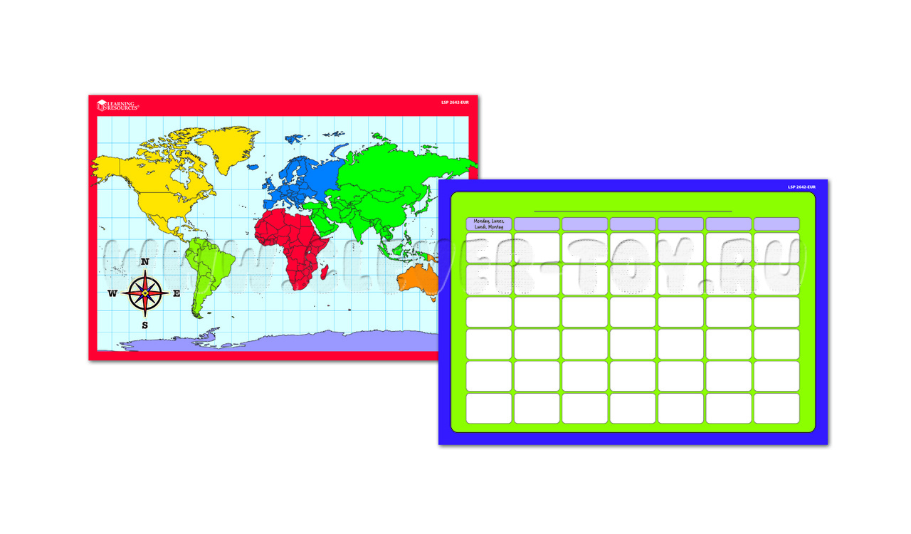 - Складываемый уголок, состоящей из 3 частей (используется и для хранения элементов набора): маркерная доска, двусторонняя карта мира, двусторонний календарь;