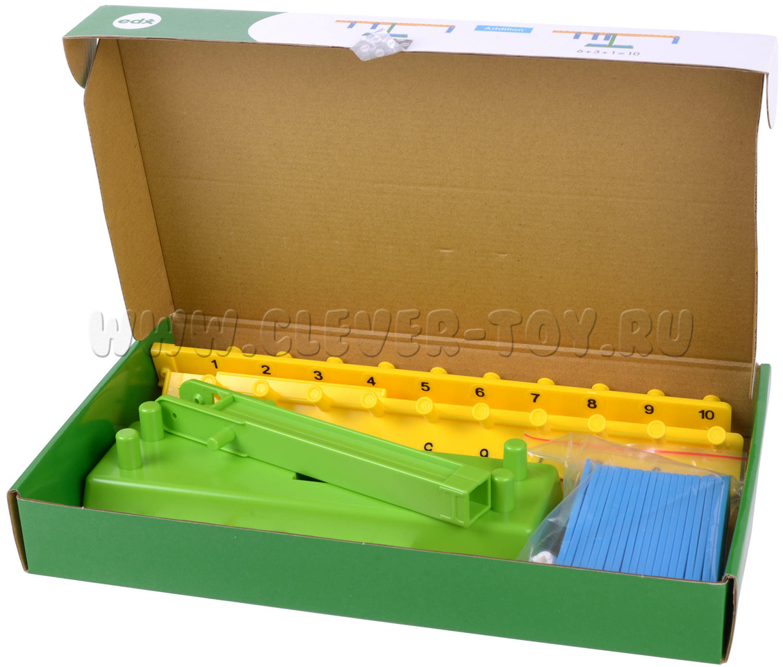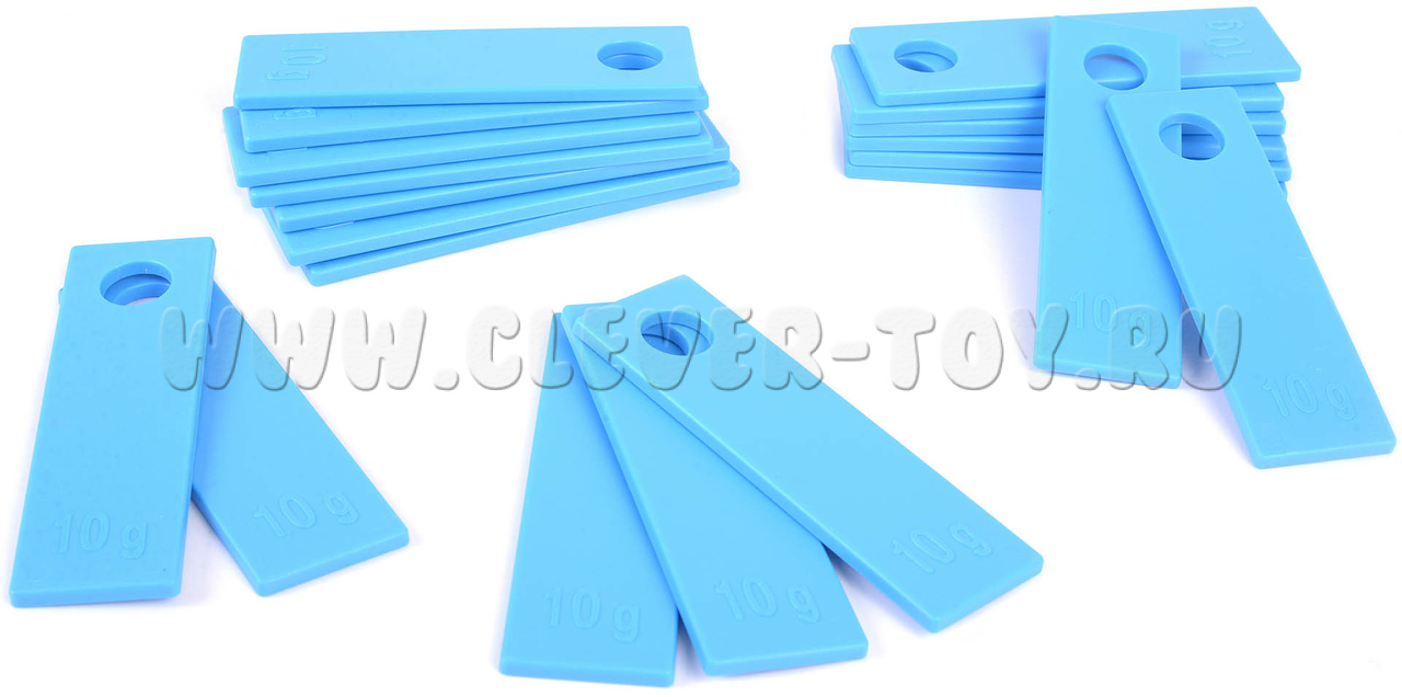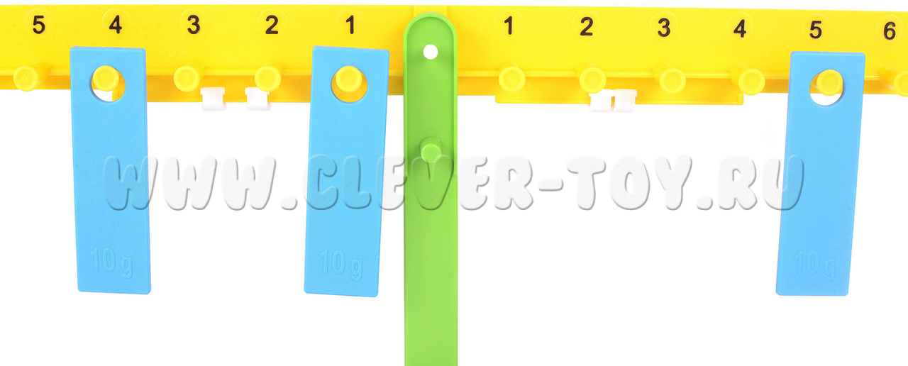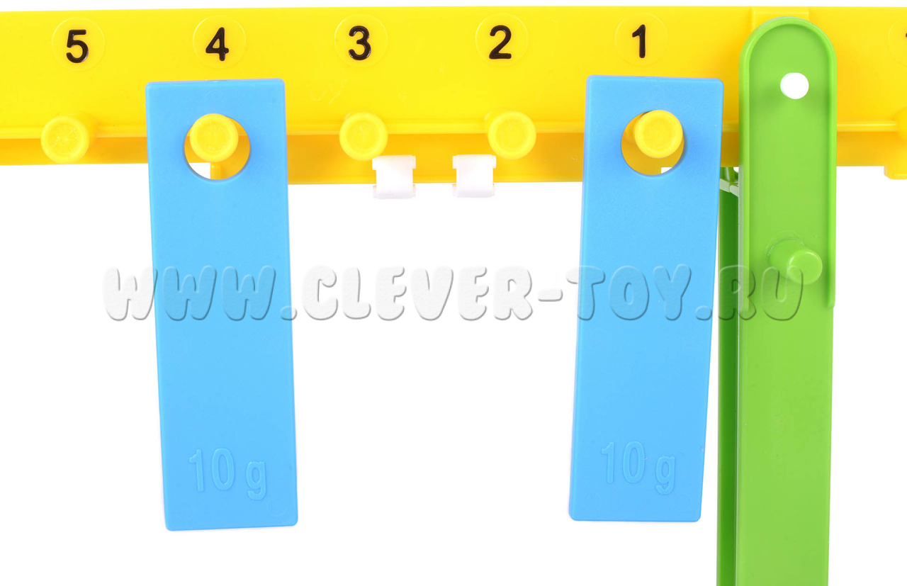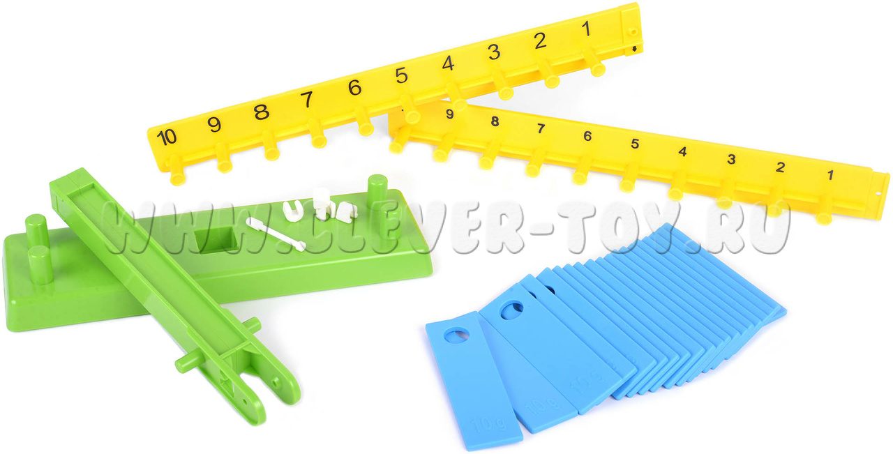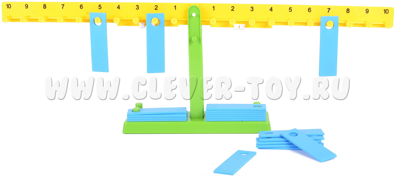 Математические весы изготовлены из высококачественной безопасной цветной пластмассы, в собранном виде на подставке весов удобно располагаются все гирьки набора (в виде плоских прямоугольников синего цвета с отверстием). Весы просты в сборке.